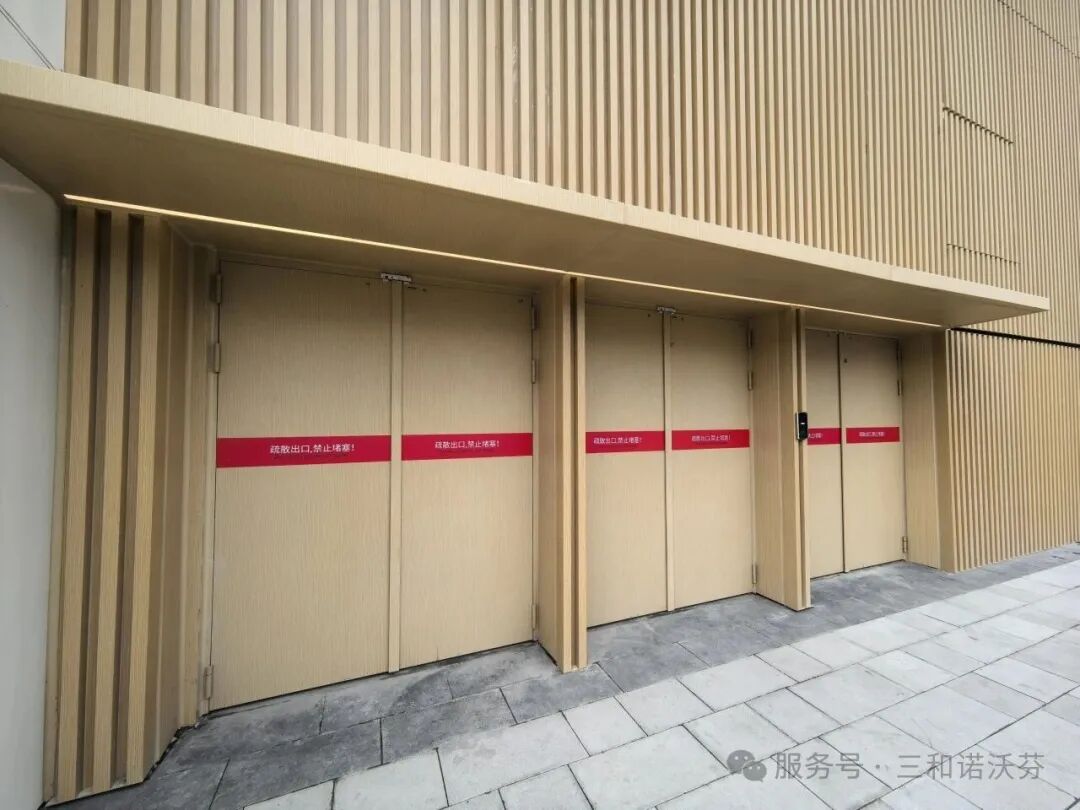 項目中庭連廊采用米白色大型甲級防火門,線條簡潔,與整體空間和諧統(tǒng)一;消防通道則使用木紋飾面防火門,弱化了應(yīng)急區(qū)域的冰冷感,增添溫馨氛圍。安全設(shè)施由此融入環(huán)境,實現(xiàn)功能與視覺的雙重舒適。