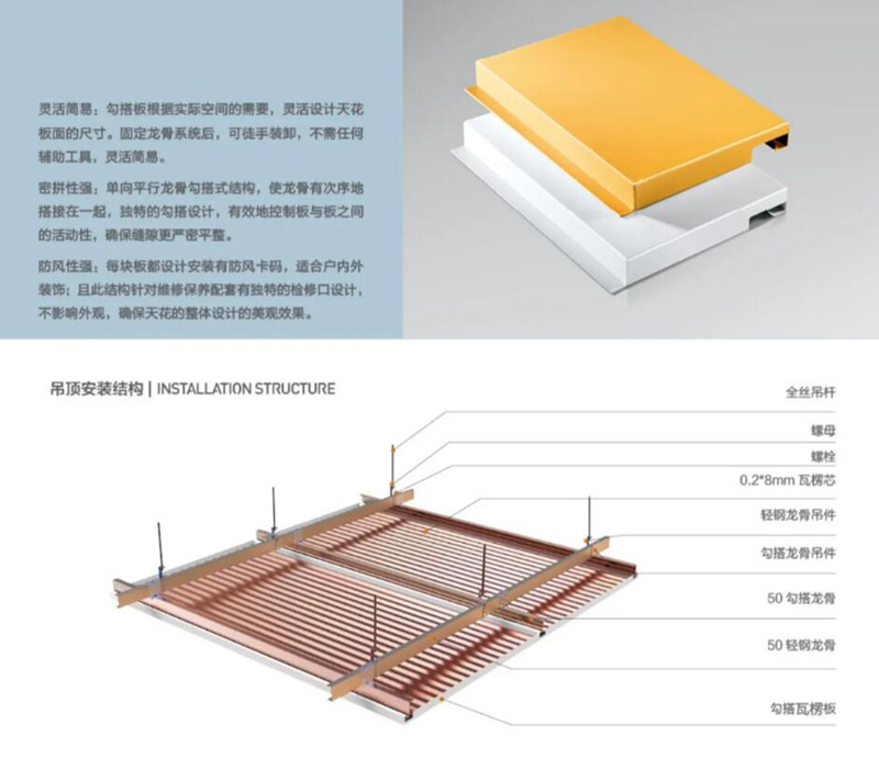 - 特性:浦菲爾勾搭頂板采用勾搭設(shè)計,可根據(jù)空間需求靈活設(shè)計尺寸,安裝簡單,密拼性強,每塊板都設(shè)計安裝有防風卡碼,檢修方便,適合戶內(nèi)外裝飾。
