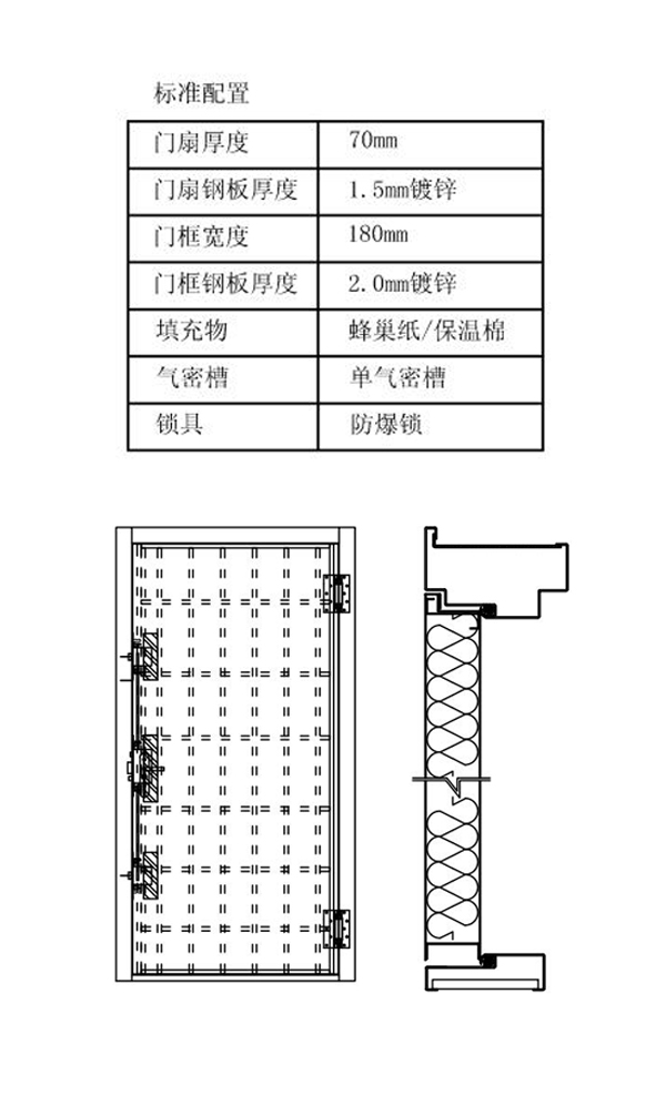 門框采用180mm寬的2.0mm鍍鋅冷軋鋼板制成,內(nèi)嵌密封條;